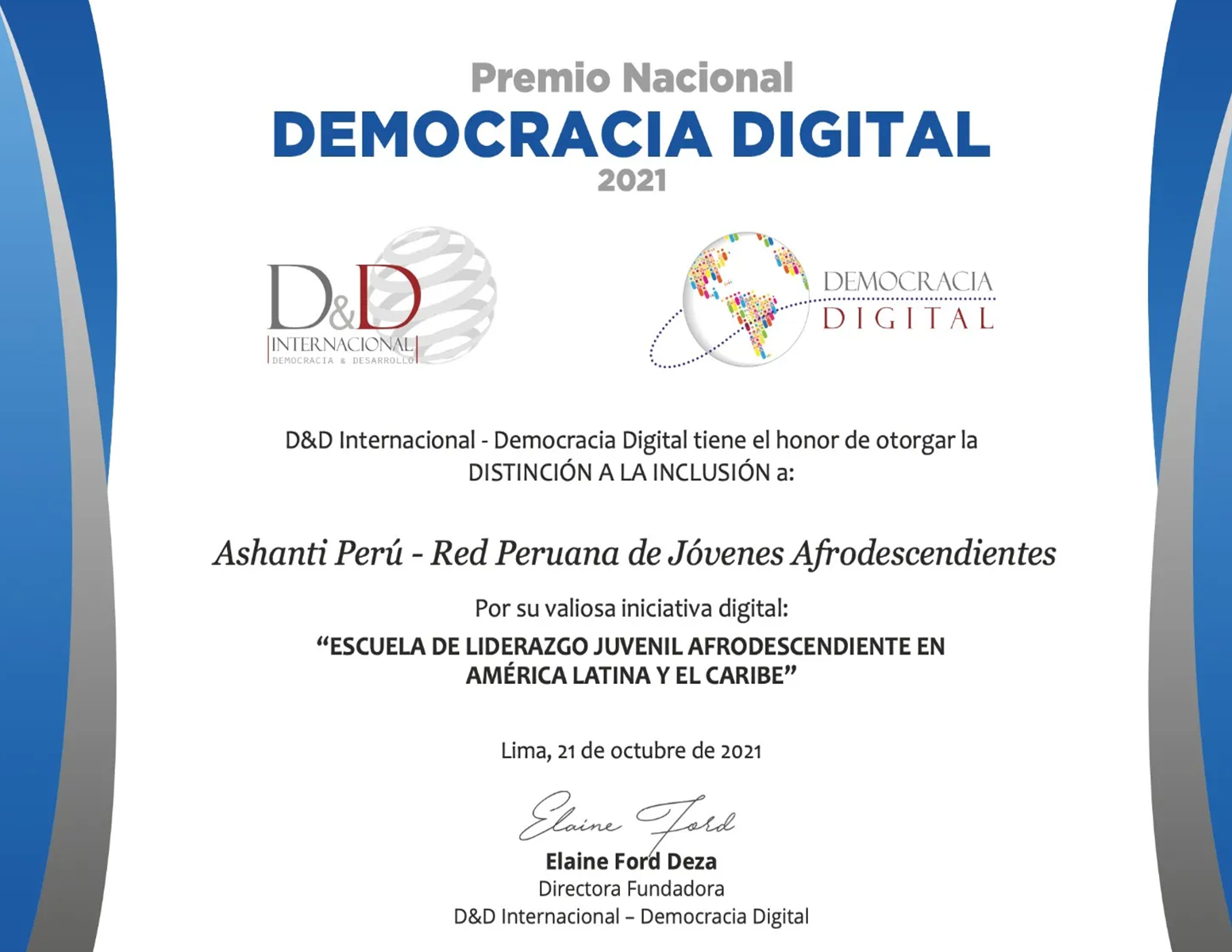 En el 2012, el JNE le otorgó el reconocimiento nacional “Mejores prácticas ciudadanas de jóvenes” a Ashanti por su trabajo constante en la promoción de la agenda joven afrodescendiente en el país. Este trabajo se concretizó con la inclusión.